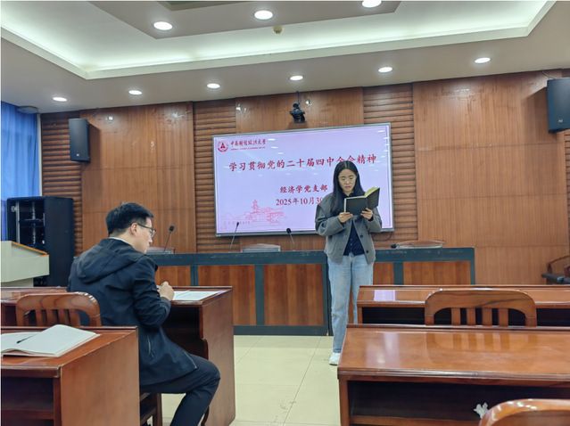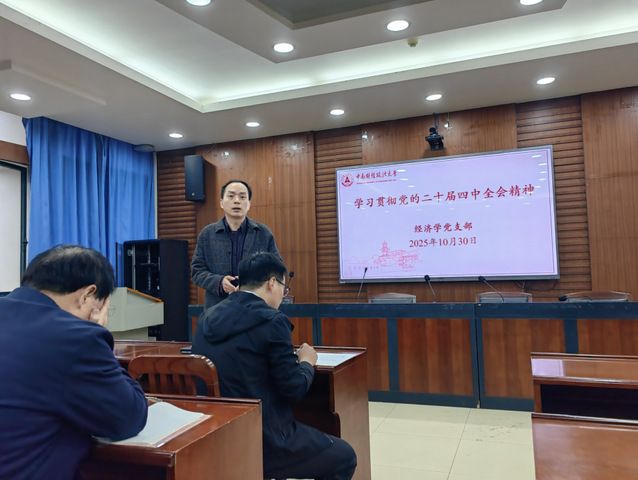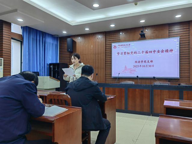 为深入学习贯彻党的二十届四中全会精神,切实把思想和行动统一到党中央决策部署上来,10月30日下午,中国av 经济学党支部在文泉南206会议室组织召开专题学习会,围绕全会审议通过的《中共中央关于制定国民经济和社会发展第十五个五年规划和二〇三五年远景目标的建议》展开深度研讨。党支部书记谢靖主持会议并作领学发言,党支部全体党员教师参加会议。