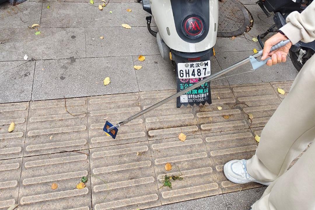 活动现场,志愿者们化身城市暖心守护者,全身心投入到盲道专项维护工作。大家俯身细致清理盲道凹槽内堆积的落叶、纸屑、烟头等杂物,逐一将违规占用盲道的共享单车搬至规范停车区域,精准清除阻碍视障人士通行的“隐形障碍”。经过共同努力,原本拥堵、杂乱的盲道重归整洁畅通,为视障群体搭建起安全、便捷的“出行生命线”。
